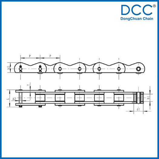 | Pitch P (mm) | Inner width of inner link b1 (mm) | Diameter of roller d1 (mm) | Diameter of pin d2 (mm) | Length of pin L (mm) | Height of sidebar h2 (mm) | Thickness of sidebar T (mm) | Height of attached plate H2 (mm) | Tensile strength Q (KN) |